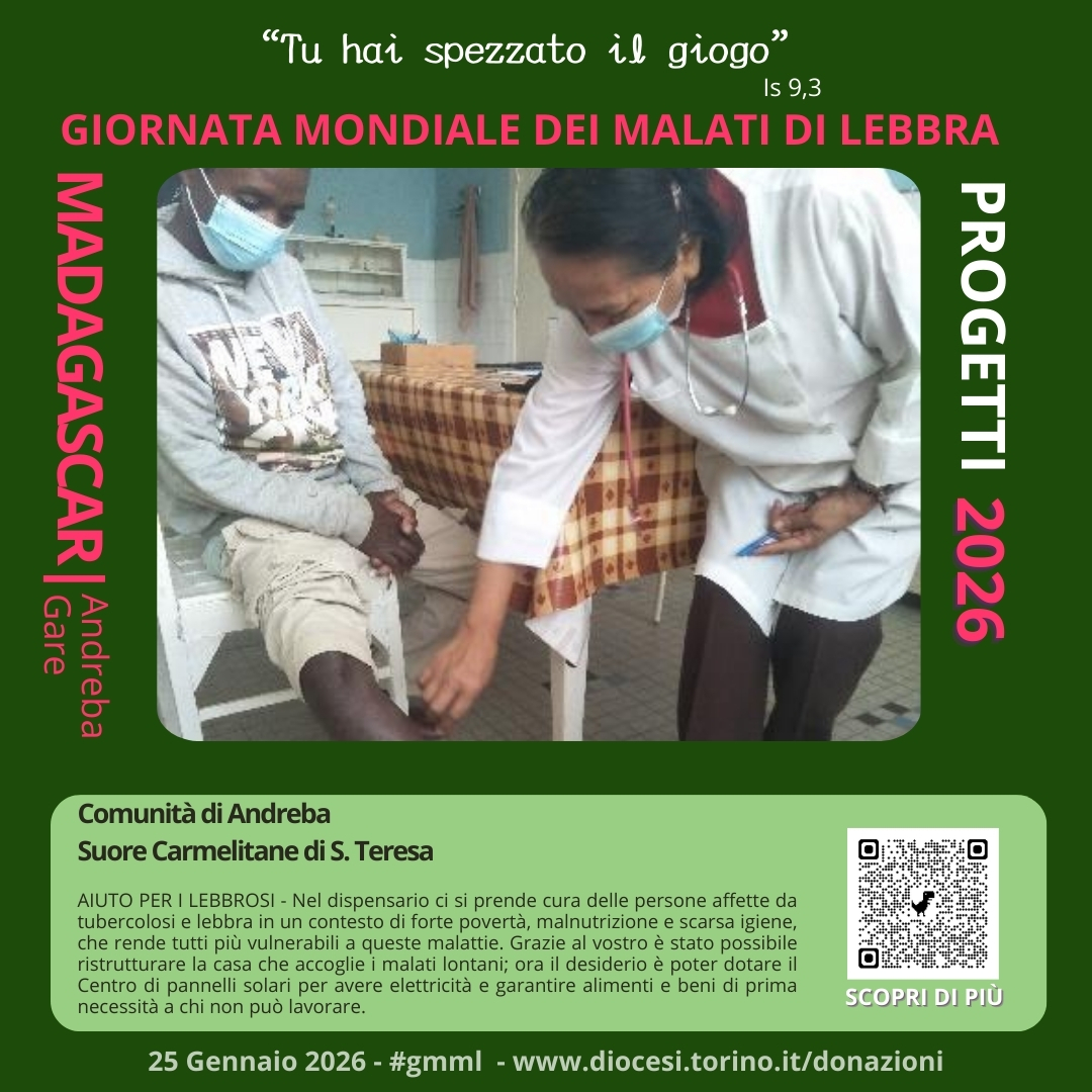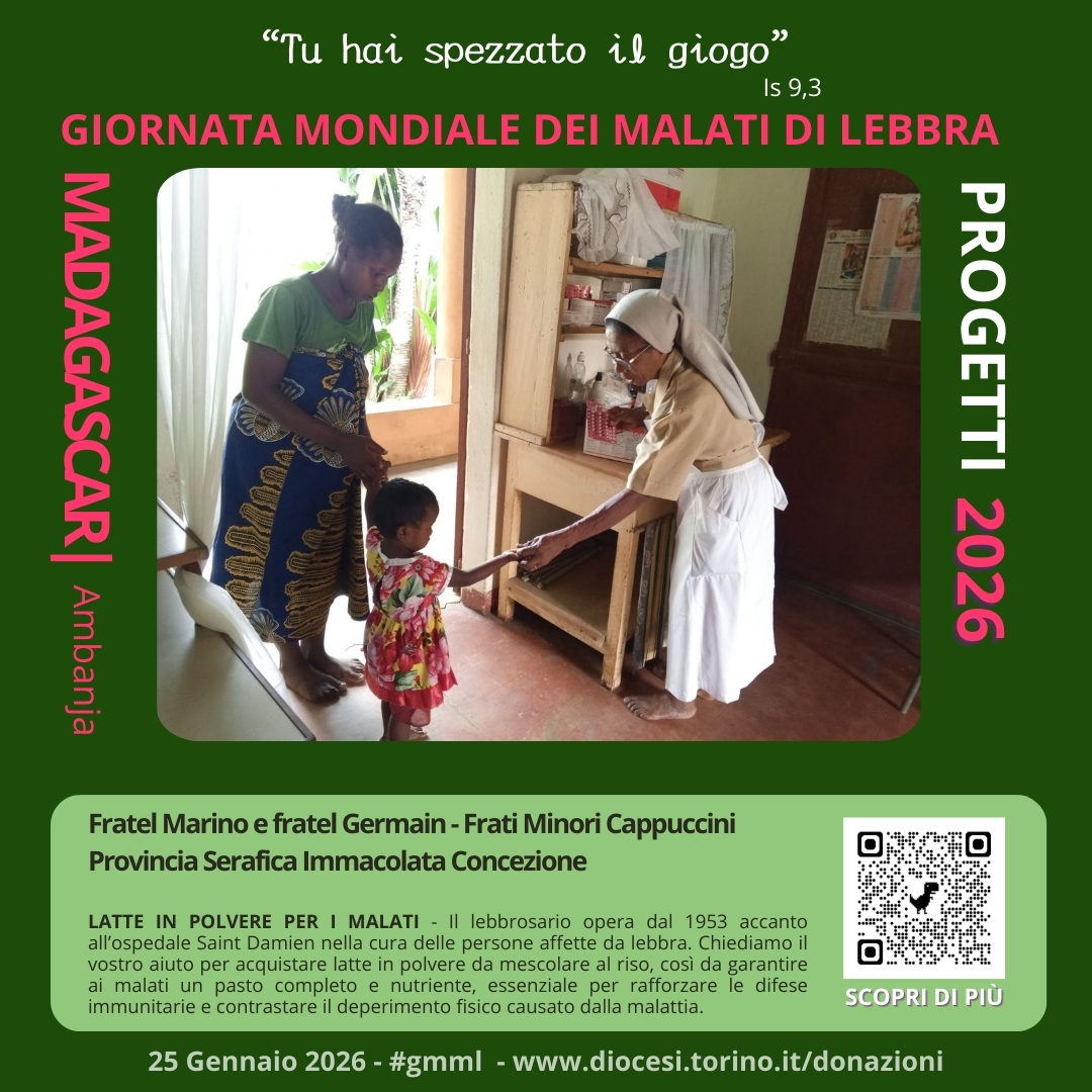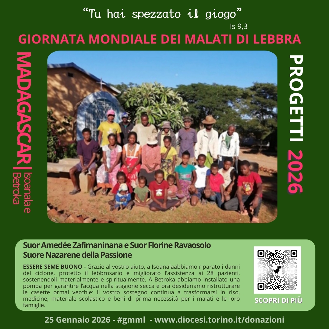 Grazie alla generosità di parrocchie, enti e privati, l’Arcidiocesi di Torino, attraverso lo Sportello Diocesano Collette e Donazioni, può sostenere ogni anno progetti di cura, prevenzione, riabilitazione e sostegno alle famiglie in Brasile, India, Madagascar, Etiopia, Colombia e in altri Paesi, come illustrato nel pieghevole GML 2026 (clicca qui per consultare la pagina PROGETTI).