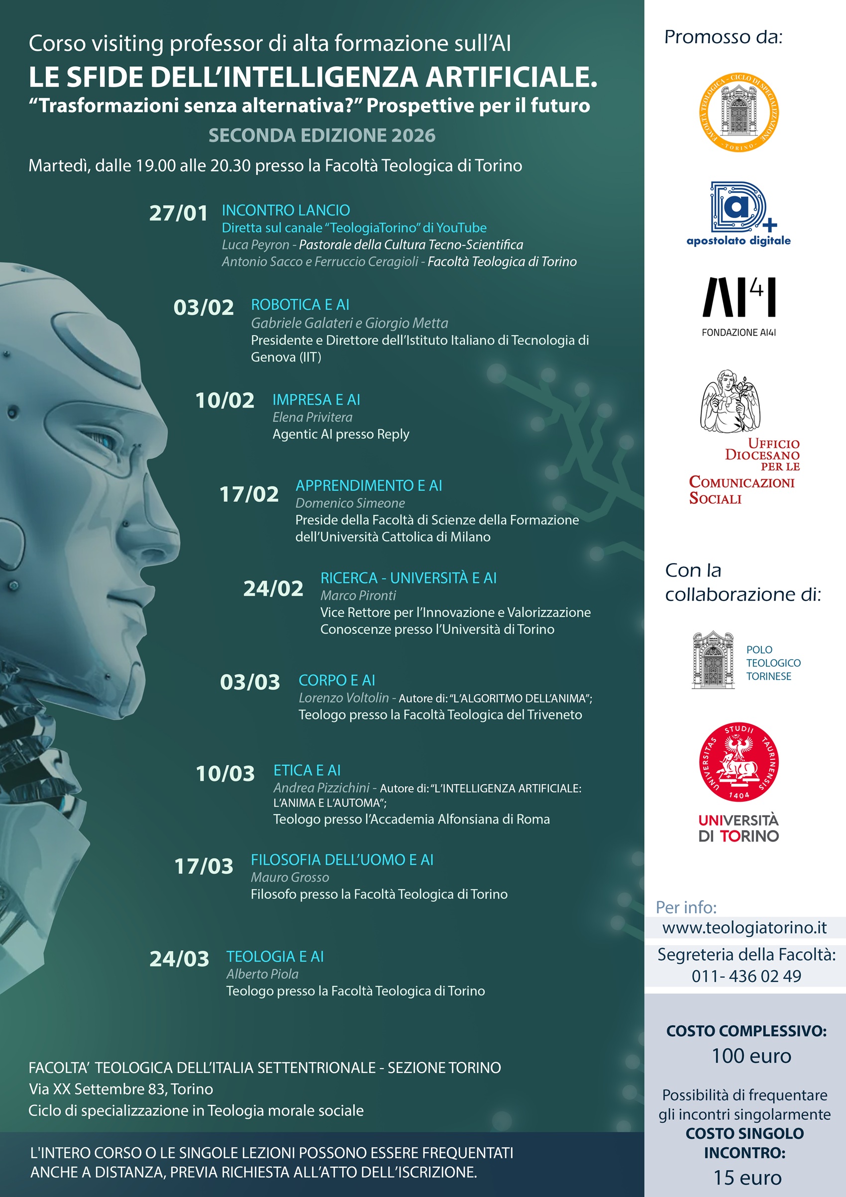 Il primo incontro di lancio del corso è aperto a tutti anche senza iscrizione, solo on-line, martedi 27 gennaio, dalle 19 alle 20, per ricordare alcuni aspetti centrali della questione dell’AI e le proposte del corso, sul canale YouTube “Teologia Torino”.