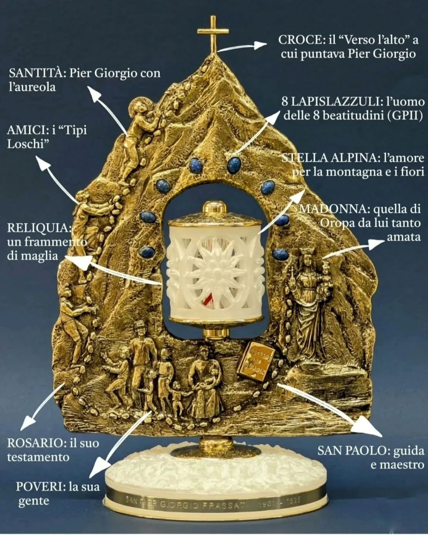 Al centro, la reliquia è custodita in una teca in alabastro lavorato, che richiama la stella alpina. Attorno, otto pietre di lapislazzulo evocano le Beatitudini, secondo l’espressione con cui san Giovanni Paolo II definì Frassati: “l’uomo delle otto beatitudini”. Completano l’opera altri riferimenti essenziali della sua vita spirituale: la Madonna di Oropa, le Lettere di san Paolo e l’Eucaristia, posta simbolicamente come fonte e culmine del suo cammino.