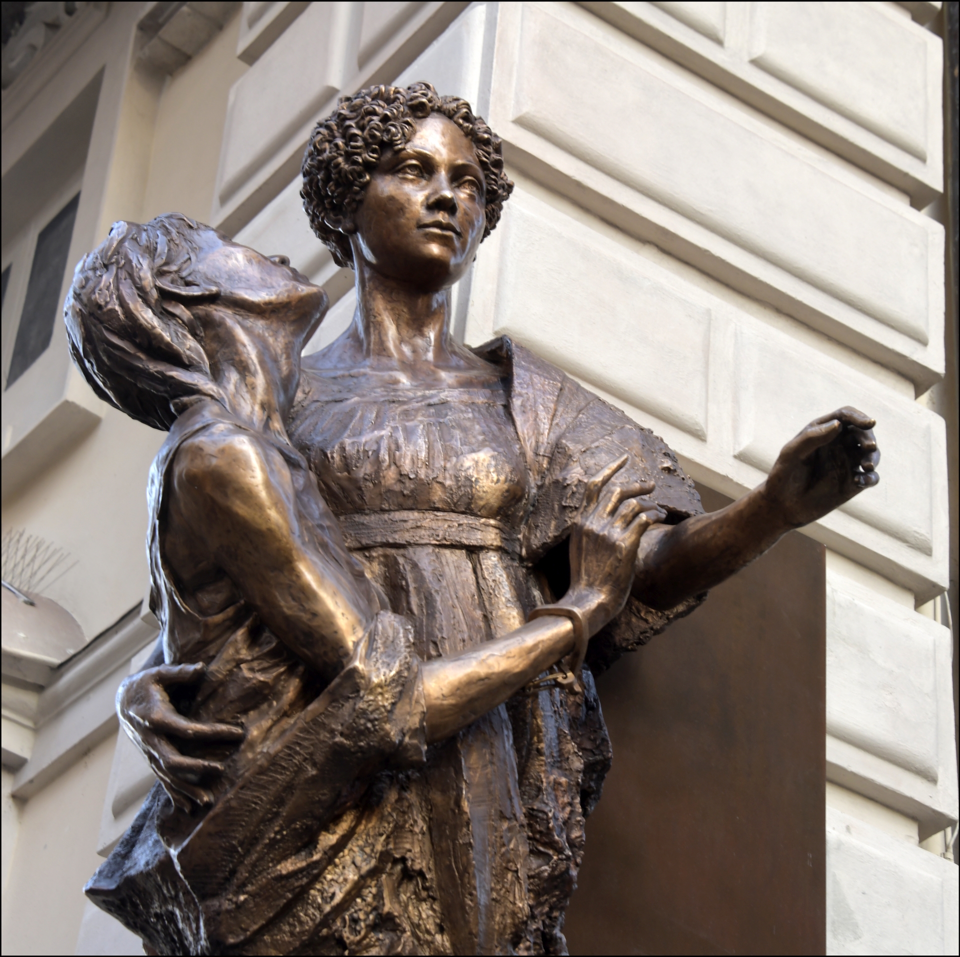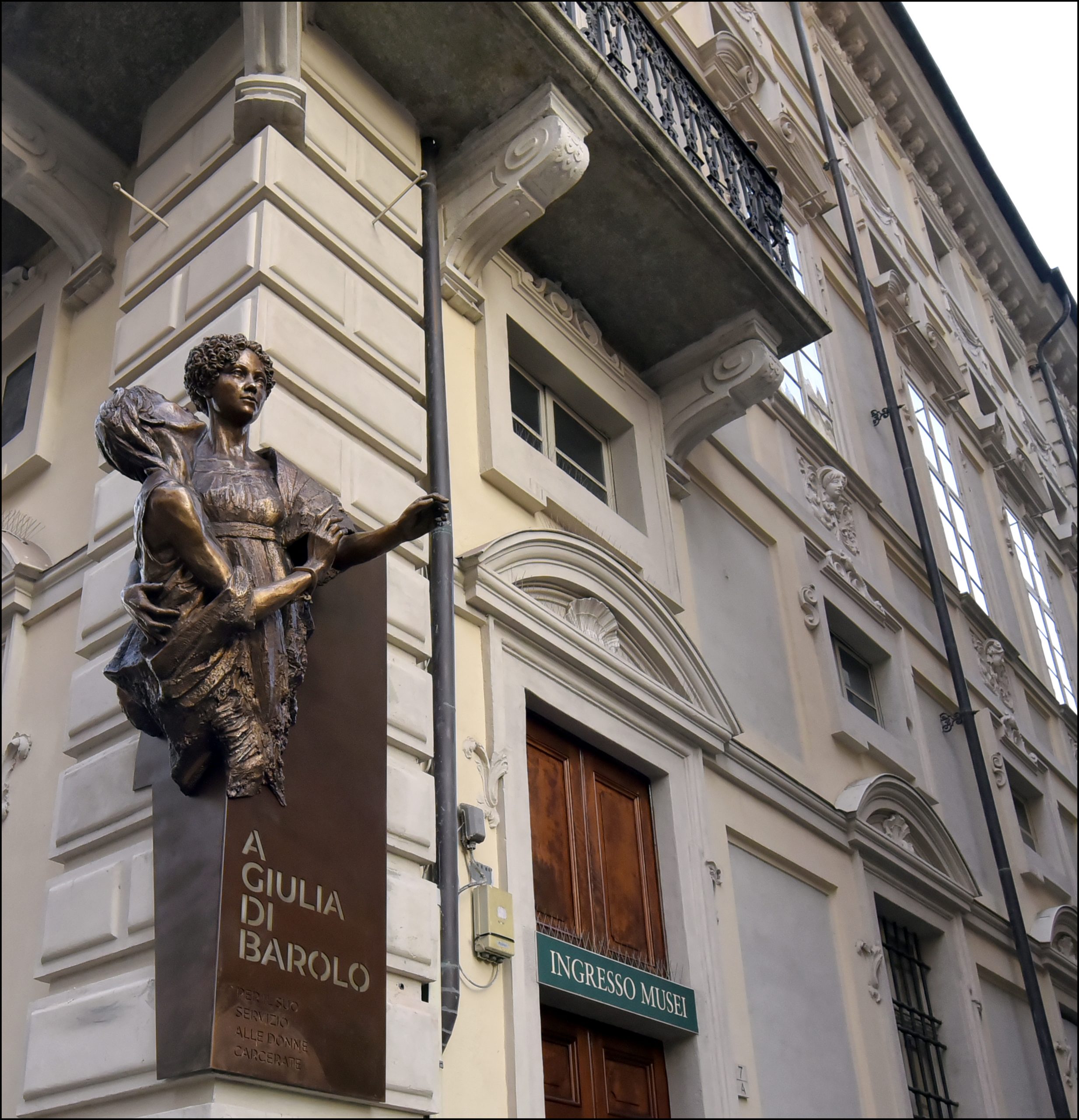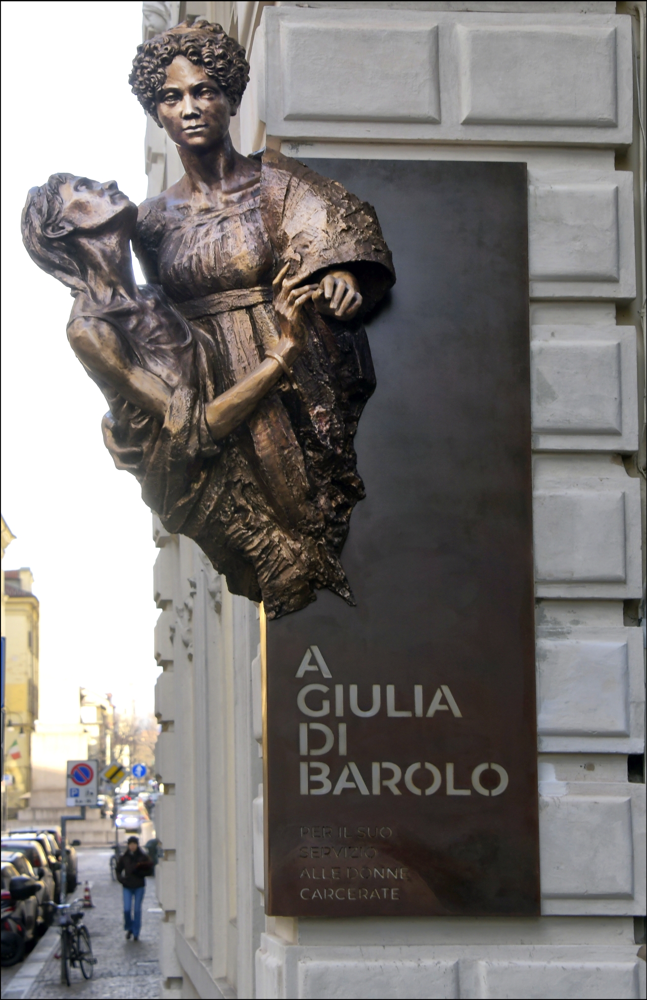 Realizzato da Gabriele Garbolino Rù con la curatela artistica di Enrico Zanellati, il monumento è una scultura in bronzo in cui sono raffigurate due donne, Giulia di Barolo e una carcerata che lei tiene tra le braccia. L’autore dell’opera, docente dell’Accademia Albertina di Belle Arti di Torino – ha potuto studiare i ritratti custoditi a Palazzo Barolo, lasciandosi inoltre guidare dalle “Memorie sulle carceri” scritte in prima persona dalla marchesa e realizzando una reinterpretazione contemporanea della sua figura, in dialogo con la maestosa facciata del Palazzo che sostiene la scultura.