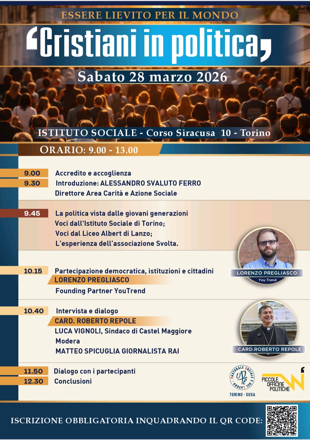 Giovani e politica, partecipazione e inclusione per la costruzione del bene comune. Ne parleranno nella mattinata di sabato 28 marzo, dalle 9.30 alle 12.30 all’Istituto Sociale (corso Siracusa 10, Torino), l’arcivescovo di Torino, cardinale Roberto Repole, e il ventinovenne sindaco di Castel Maggiore (Bologna) Luca Vignoli (intervistati dal giornalista Matteo Spicuglia), l’analista politico Lorenzo Pregliasco di Youtrend, alcuni studenti degli istituti Sociale di Torino e Albert di Lanzo Torinese e altri giovani che hanno seguito i percorsi di educazione civica e formazione politica proposti dai laboratori delle “Piccole Officine Politiche”.